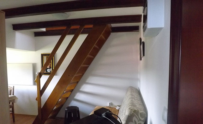 Studio-dupleks br.6. Ova smeštajna jedinica sastoji se iz dve celine povezane stepenicama. Studio prima max 5 osoba. U prvom nivou dupleksa nalazi se hodnik, dnevni boravak sa kuhinjom, trpezarijom i kupatilom. U ovom prostoru smešten je krevet na klik-klak i fotelja na razvlačenje. Drugi nivo sastoji se od spavaće sobe sa dva ležaja 90/200. Površina studija 46m2.